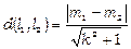 Відстань d (l 1, l 2) між паралельними прямими l 1: y = kx + m 1 та l 2: y = kx + m 2 знаходиться за формулою