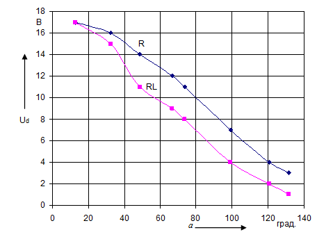 Рисунок 2 – Регулировочная характеристика: R – при активной нагрузке, RL – при активно – индуктивной нагрузке.