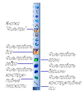 На инструментальной панели Измерения расположены кнопки команд, позволяющих выполнять измерения: подсчитывать длины ребер и площадь граней, определять расстояния между ними, вычислять массо-центровочные характеристики модели (рисунок 11). Команды инструментальной панели Фильтры позволяют выделять в модели только определенные ее элементы: грани, ребра, вершины и т. д. (рисунок 12).