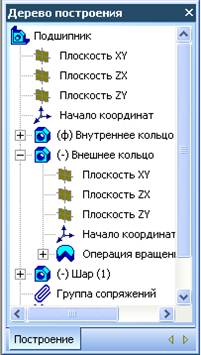 Дерево построения, по умолчанию, располагается в левой части программного окна KOMПAC-3D V7. Оно представляет в графическом виде последовательность элементов, составляющих деталь, в порядке их создания. В дереве построения отображаются следующие элементы: наименование детали плоскости, символ начала координат, операции, эскизы и оси (рисунок 14).