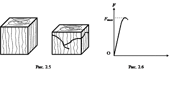 При испытании вдоль волокон образец доводят до разрушения, древесина при этом претерпевает небольшие остаточные деформации. При сжатии на первоначальном участке древесина работает упруго с прямолинейной диаграммой (рис. 2.6). Разрушение происходит с обмятием торцов, нередко с появлением продольных и наклонных трещин.