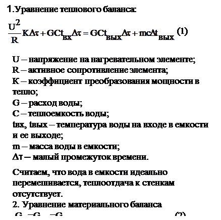 Составление математического описания объектов управленияДля получения математических объектов используют уравнения материальных тепловых балансов; экспериментальные полученные зависимости выхода и входа: кривые изменения координат объекта, полученные в ходе опытной эксплуатации и т.д.