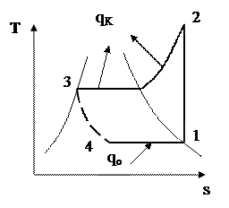 Циклы холодильных установок, в отличие от циклов тепловых двигателей, являются обратными. Удельная холодопроизводительность холодильной установки qo, кДж/кг: qo = h1 – h4.