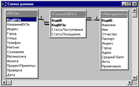 Рис. 6.5. Окно диалога Связи После установки флажка Обеспечение целостности данных, Access делает доступными еще два флажка: Каскадное обновление связанных полей и Каскадное удаление связанных записей. При установленном флажке Каскадное обновление связанных полей Microsoft Access обновляет все значения чужих ключей в дочерних таблицах (то есть в таблицах на стороне отношения «многие» при связи «один-ко-многим») при изменении значения первичного ключа в родительской таблице, которая находится на стороне отношения «один» при связи «один-ко-многим». Если же вы установите флажок Каскадное удаление связанных записей, Microsoft Access удалит дочерние строки (связанные строки в дочерних таблицах) при удалении родительской строки (связанная строка в родительской таблице). Например, если вы решили удалить некоторый вуз из базы данных, то в этом случае следует удалить соответствующие данные в связующей таблице. Access автоматически выполнит эту операцию, если установлен флажок Каскадное удаление связанных записей. Кроме того, коды вузов время от времени могут меняться. Установите флажок Каскадное обновление связанных полей, чтобы при изменении кода вуза Access автоматически обновлял записи в таблице тСвязьАбВУЗ. Окно диалога Добавление таблицы дает возможность добавить как таблицы, так и запросы. Иногда требуется определить связи между таблицами и запросами или только между запросами. Вы можете также определить так называемые внешние объединения, нажав кнопку Объединение в окне диалога Связи. С помощью внешнего объединения вы сможете найти, например, те вузы, к которым студенты не проявили интереса. После нажатия кнопки Создать Access создаст связь и нарисует линию между двумя таблицами, указывающую на наличие связи между ними. Заметьте, когда вы просите обеспечить целостность данных, Access изображает на конце линии у таблицы, находящейся на стороне отношения «один», цифру 1, а на другом конце у таблицы со стороны отношения «многие» – символ бесконечности. Чтобы удалить связь, щелкните по ее линии и нажмите клавишу Del. Если вы хотите отредактировать или изменить существующую связь, дважды щелкните по соответствующей линии, чтобы снова открыть окно диалога Связи.