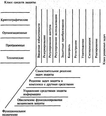 Первые два критерия являются очевидными, они естественным образом вытекают из предыдущего анализа. Поясним только мотивы выделения в самостоятельный класс криптографических средств. Основные из этих мотивов состоят в следующем: 1) криптографическое преобразование является сугубо специфическим средством защиты, причем требующим весьма тщательного отношения, поскольку видимость закрытия еще не означает действенного закрытия, а усложнение способа преобразования, естественно, ведет к увеличению расходов средств на само преобразование; 2) в условиях расширения сферы защиты информации, распространения развиваемых здесь концепций на защиту промышленной, коммерческой, банковской тайны, а также на защиту конфиденциальной информации существенно возрастает интерес к криптографии как средству защиты, поскольку небольшие объемы информации, содержащей перечисленные выше разновидности тайны, на не очень большой период времени могут быть достаточно надежно закрыты сравнительно простыми способами преобразования; 3) криптографическое преобразование данных в современных АСОД может быть реализовано как аппаратными средствами, так и программными и организационными, в силу чего криптографические средства не представляется возможным включить в какой-либо один из основных классов средств защиты. В качестве третьего критерия классификации выбрано функциональное назначение средств. Это предопределено тем, что средства защи-; ты в общем случае могут использоваться как для непосредственного решения задач зашиты (самостоятельно или в комплексе с другими средствами), так и для управления средствами защиты и для обеспечения функционирования механизмов и систем защиты. Таким образом, в итоге общесистемной классификации средств защиты сформировано 160 (10x4x4) различных подклассов средств защиты. В рамках этой классификационной структуры в следующем самостоятельно рассмотрим некоторые из выделенных классов средств.