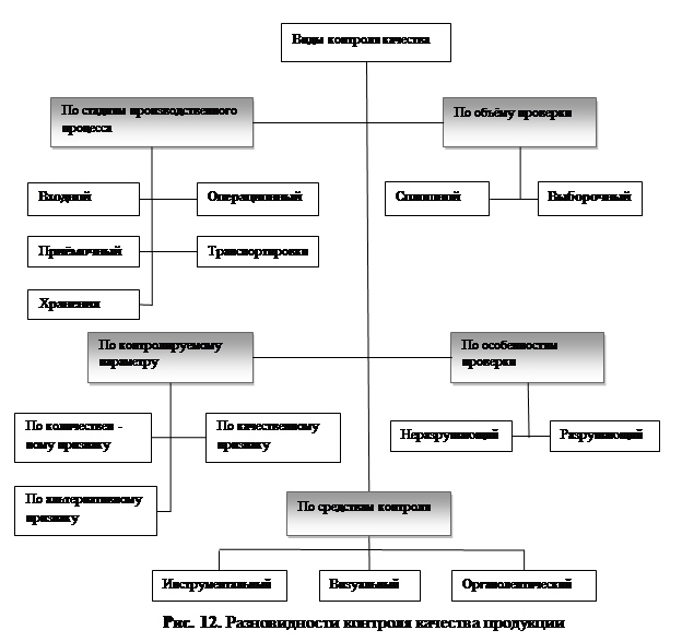 Контроль качества — деятельность, включающая проведение измерений, экспертизы, испытаний или оценки параметров объекта и сравнение полученных величин с установленными требованиями к этим параметрам. Основные виды контроля качества продукции приведены на рис. 12. По способу отбора контролируемой продукции различают сплошной (100-процентный) и выборочный контроль. Сплошной контроль является трудоемким и дорогостоящим, поэтому в крупносерийном и массовом производстве контролю подвергают лишь часть партии продукции (выборку). Если качество продукции в выборке отвечает установленным требованиям, то вся партия считается соответствующей этим требованиям, если нет, то вся партия бракуется. Однако при таком методе контроля сохраняется вероятность ошибочной браковки (ошибки первого рода или риска поставщика) или, наоборот, признания партии изделий годной (ошибки второго рода или риска заказчика). Обе возможные ошибки, выражаемые в процентах, отдельно оговариваются при заключении контрактов на поставку продукции.