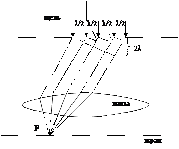 Пусть на щель падает плоская волна. Разобьём щель на узкие полости – зоны так, чтобы разность хода между соседними = λ/2. Тогда соседние зоны погасят друг друга и в зависимости от того, чётное или нечётное число зон поместилось в щели линзы в точке Р экрана даст тёмную или светлую полоску. Итак, если разность хода между крайними лучами