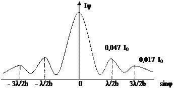 График распределения интенсивность света Iφ в зависимости от угла sinφ падения света на экран имеет вид показанный на рисунке. Центральный максимум по интенсивности значительно превышает все остальные.