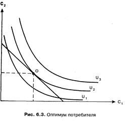 Мы получили уравнение межвременного бюджетного ограничения потребителя, которое показывает, какой суммой средств должны располагать потребители в течение двух жизненных периодов. На рис. 6.1 изображено бюджетное ограничение потребителя, показаны варианты сочетания потребления первого и второго периодов, которые может выбрать потребитель. Предпочтения потребителя между потреблением в 1-м и 2-м периодах представлены с помощью кривых безразличия (рис. 6.2). Каждая кривая безразличия характеризует равный уровень полезности для потребителя разных наборов потребления сегодня и в будущем. для потребителя предпочтительны более высокие кривые безразличия, так как они обеспечивают большее потребление. Потребители, максимизируя свою полезность, стремятся достичь наиболее высокой кривой безразличия. Однако их стремления ограничены межвременным бюджетным ограничением. Оптимальное сочетание потребления 1-го и 2-го периодов достигается в точке О, где наивысшая кривая безразличия, которой может достичь потребитель, является тельной к линии бюджетного ограничения (рис. 6.3).