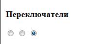 </form> Одним из вариантов обработки формы может быть пересылка данных по электронной почте: action="mailto:Aдpec@cepвep.домен" С помощью атрибута method можно задать протокол для пересылки данных на сервер. Протокол GET используется по умолчанию, но в большинстве случаев он не удовлетворяет разработчиков, поэтому чаще используется протокол POST. Атрибут enctype позволяет указать способ кодирования содержимого формы. Форму заполняют разные пользователи, поэтому для нее предусмотрен атрибут, который позволяет определить список допустимых кодировок: accept-charset="список кодировок" Можно также определить список допустимых типов данных: accept="список типов данных" Большинство форм снабжаются кнопками, которые позволяют очистить (reset"форму или подтвердить (submit) правильность ее заполнения и отослать данные. Чтобы определить программы-сценарии, которые должны выполняться после указанных действий пользователя, существуют два атрибута событий onsubmit и on reset. Стандартные атрибуты: id, class, lang, style, dir, title, target, атрибуты событий <INPUT> Этот элемент позволяет создавать различные части формы, такие как флажки переключатели, поля ввода. Элемент не имеет конечного тега, так как все параметры задаются при помощи атрибутов. Вид элемента определяет атрибут type: • type="text" — создание поля ввода, в котором можно автоматически разместить произвольный текст, используя атрибут value; • type="password" — создание поля для ввода пароля, причем введенная информация отображается звездочками; • type="checkbox" — создание флажка; • type="radio" — определение одного переключателя. Для создания группы переключателей необходимо использовать несколько элементов INPUT. Вот пример группы из трех переключателей: <h3> Переключатели </h3> <INPUT type="radio" name="S001" vаluе="Первый"> <INPUT type="radio" name="S001" vаluе ="Второй"> <INPUT type="radio" name="S001" vаluе ="Третий" checked> Атрибут checked определяет, какой из переключателей должен быть выбран по умолчанию. На рис. 4.4 показан внешний вид этой группы переключателей.