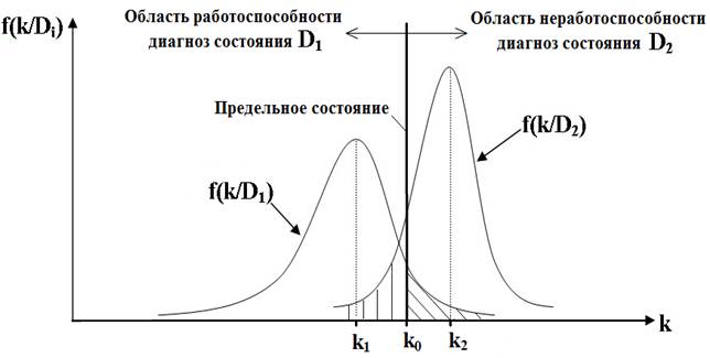 Рисунок 1. Плотность распределения функции условной вероятности показателя k для работоспособных и неработоспособных трансформаторов: f(k/D1) – функция условной вероятности появления признака k при диагнозе D1; k1 – значение показателя, при котором f(k/D1) = max; f(k/D2) – функция условной вероятности появления признака k при диагнозе D2; k2 – значение показателя, при котором f(k/D2) = max; k0 - значение параметра, при котором трансформатор переходит в предельное состояние.