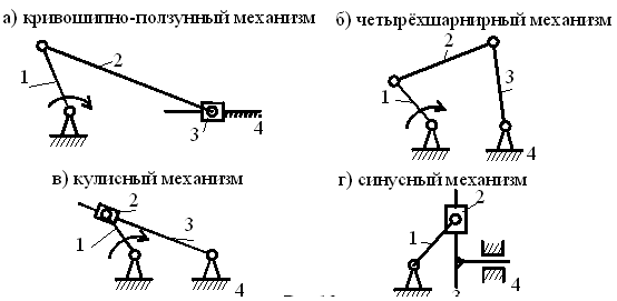 Менее распространенные классификации подразумевают наличие механизмов с низшими или высшими парами в плоском или пространственном исполнении и т.д. Учитывая возможность условного превращения практически любого механизма с высшими парами в рычажный, в дальнейшем наиболее подробно рассматривается именно эти механизмы, а структурные схемы других механизмов изложены в соответствующих разделах. Среди рычажных механизмов наиболее распространены так называемые четырехзвенные, примеры которых представлены на рисунке.