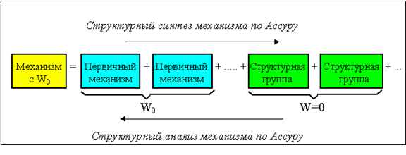 Особенность структурных групп Ассура - их статическая определимость. Если группу Ассура свободными элементами звеньев присоединить к стойке, то образуется статически определимая ферма. Используя группы Ассура, удобно проводить структурный, кинематический и силовой анализ механизмов. Для определения класса механизма его расчленяют на структурные группы, начиная с конца механизма. За начало механизма принимают ведущее звено (начальный механизм). От конца механизма отделяются поочерёдно простейшие структурные группы до тех пор, пока не останется лишь механизм 1-го класса (начальный механизм, их может быть несколько). По классу структурных групп определяют класс механизма. Количество начальных механизмов равно величине W. Пример расчленения плоского рычажного механизма на структурные группы показан на рисунке. Предварительно вычисляют степень подвижности механизма W по формуле