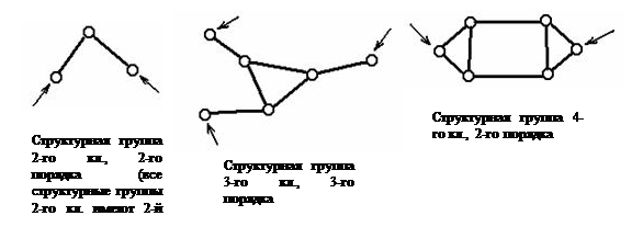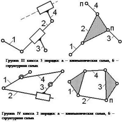 На структурной схеме для большей наглядности можно те шарниры, которым на кинематической схеме соответствуют поступательные пары, помечать буквой «п». В структурных схемах групп III класса внутренние шарниры образуют один или несколько треугольников жесткой (неизменяемой) конфигурации; в схемах групп более высоких классов встречаются многоугольники (изменяемой конфигурации) с четырьмя и большим числом сторон, которое и определяет класс группы. Отметим, что классификации Л. В. Ассура подчиняются только те плоские механизмы, у которых начальные звенья образуют кинематические пары со стойкой. Наиболее распространённые структурные группы 2-го класса подразделяются на 5 видов (модификаций) (см. табл.).