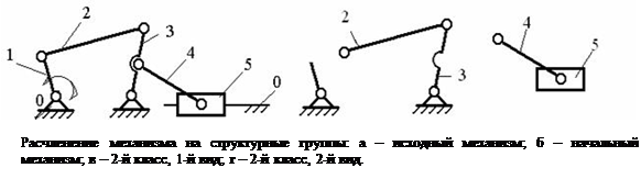 стойка – звено, принимаемое за неподвижное; такое звено в механизме может быть только одно; кривошип – вращающееся звено рычажного механизма, которое может совершать полный оборот вокруг неподвижной оси; коромысло – вращающееся звено рычажного механизма, которое может совершать только неполный оборот вокруг неподвижной оси; шатун – звено рычажного механизма, образующее кинематические пары только с подвижными звеньями; кулиса – звено рычажного механизма, вращающееся вокруг неподвижной оси и образующее с другим подвижным звеном поступательную пару; в зависимости от степени протяженности элемента поступательной пары различают «камень» (звено меньшей протяженности) и «направляющую»; ползун – звено рычажного механизма, образующее поступательную пару со стойкой; кулачок – звено, имеющее элемент высшей пары, выполненный в виде поверхности переменной кривизны; камень – звено, совершающее поступательное движение относительно подвижной направляющей, называемой кулисой; зубчатое колесо – звено с замкнутой системой зубьев, обеспечивающее непрерывное движение другого зубчатого колеса или рейки. Количество типов и видов механизмов исчисляется тысячами, поэтому классификация их необходима для выбора того или иного механизма из большого ряда существующих, а также для проведения синтеза механизма. Универсальной классификации нет, но наиболее распространены 3 вида классификации: Функциональная. По принципу выполнения технологического процесса механизмы делятся на механизмы: приведения в движение режущего инструмента; питания, загрузки, съёма детали; транспортирования и т.д.; Структурно-конструктивная. Предусматривает разделение механизмов как по конструктивным особенностям, так и по структурным принципам. К этому виду относят механизмы: кривошипно-ползунный; кулисный; рычажно-зубчатый; кулачково-рычажный и т.д.; Структурная. Проста, рациональна, тесно связана с образованием механизма, его строением, методами кинематического и силового анализа, была предложена Л.В. Ассуром[2] в 1916 году и основана на принципе построения механизма путем наслоения (присоединения) кинематических цепей (в виде структурных групп) к начальному механизму. Согласно этой классификации, любой механизм можно получить из более простого присоединением к последнему кинематических цепей с числом степеней свободы W = 0, получивших название структурных групп, или групп Ассура. Недостаток классификации – неудобство для выбора механизма с требуемыми свойствами. Структурная классификация механизмов по Ассуру Л.В.
