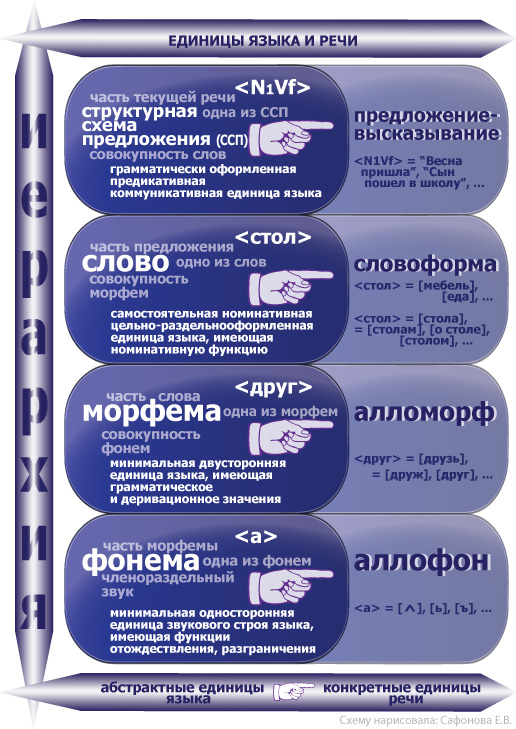 Фонема – (единица фонологии) минимальная односторонняя () единица звукового строя языка, имеющая ф-ции отождествления и разграничения Морфема (единица морфологии) – минимальная двусторонняя единица языка, имеющая грамматическое и деривационное (словообразовательное) значение Слово – (единица лексикологии и грамматики) самостоятельная, номинативная, цельно-раздельно (цельно – т.е. носители могут вычленить цельное слово, раздельно – т.е. между словами есть маркеры – паузы, пробелы) оформленная единица языка с номинативной ф-цией. Структурная схема предложения (ССП) – (единица синтаксиса) грамматически оформленная, предикативная (зима – время года Зима. – предложение, добавилась предикативность и модальность), коммуникативная единица языка. Ряд структурных схем (в виде математических формул описывают структуру языка, этим занимается структурный синтаксис) Например: N1Vf Словосочетание не является единицей, значения как у слова (изучается в синтаксисе)