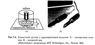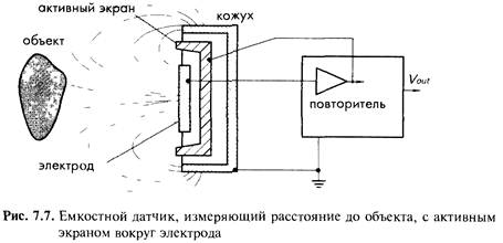 На практике при измерении перемещения электропроводного объекта, его поверхность часто играет роль пластины конденсатора На рис 7 6А показана принципиальная схема однополярного емкостного датчика, в котором одна из пластин конденсатора соединена с центральным проводником коаксиального кабеля, а другой пластиной является сам объект Отметим, что собственная пластина датчика окружается заземленным экраном, что позволяет улучшать линейность и уменьшать краевые эффекты Типовой емкостной датчик работает на частотах 3-МГц диапазона и может детектировать перемещения быстро двигающихся объектов Частотные характеристики такого датчика со встроенным электронным интерфейсом лежат в диапазоне 40 кГц Емкостные датчики приближения очень эффективны при работе с электропроводными объектами, при этом они измеряют емкость между электродом и самим объектом Емкостные датчики также достаточно хорошо работают и с непроводящими объектами, но при этом их точность несколько ухудшается Любой объект, попадающий в окрестность электрода, обладает своими собственными диэлектрическими свойствами, которые изменяют емкость между электродом и корпусом датчика, что, в свою очередь, приводит к появлению выходного сигнала, пропорционального расстоянию между объектом и детектором. Для повышения чувствительности и снижения краевых эффектов в однополярном емкостном датчике применяют активное экранирование. При этом экран размещается вокруг нерабочих сторон электрода и на него подается напряжение, равное напряжению на электроде. Поскольку напряжения на экране и электроде имеют одинаковые амплитуды и фазы, между ними нет электрического поля, и все компоненты, расположенные за экраном не оказывают никакого влияния на работу датчика. Этот метод экранирования проиллюстрирован на рис. 7.7.