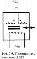 На рис. 7,10 показан ЛРДТ, соединенный с синхронным демодулятором, используемым для выпрямления синусоидального сигнала и представления его в виде выходного постоянного напряжения. Синхронный демодулятор состоит из аналогового мультиплексора и детектора пересечения нулевого уровня, преобразующего синусоидальный сигнал в прямоугольные импульсы, управляющие мультиплексором. Фаза сигнала детектора настраивается так, чтобы при нахождении сердечника в центральном положении выходное напряжение равнялось нулю. Выходной усилитель преобразует выходной сигнал к виду, совместимому с последующими схемами. Величина напряжения на выходе устройства соответствует расстоянию от сердечника до центральной точки, а его знак — направлению смещения. Для точного определения величины перемещений частота генератора должна быть, по крайней мере, на порядок выше максимальной частоты движения. При медленно меняющихся процессах стабилизированный генератор можно заменить подсоединением к сети, частота которой равна либо 60, либо 50 Гц. ЛРДТ и ПРДТ обладают следующими достоинствами: 1. Датчики, реализованные на их основе, являются бесконтактными устройствами, с практически нулевыми потерями на трение. 2. Незначительным гистерезисом как магнитным, так и механическим. 3. Очень низким выходными импедансом. 4. Высокой помехоустойчивостью. 5. Прочной и надежной конструкцией. 6. Очень высокой разрешающей способностью. Примером датчиков перемещений на основе ЛРДТ является так называемая измерительная головка, применяемая во многих видах тестового оборудования. В таких системах внутренний сердечник ЛРДТ подвешен на пружине, возвращающей измерительную головку в исходное положение. ПРДТ работают на том же принципе, что и ЛРДТ, за исключением того, что в них используются вращающиеся сердечники. Основное применение ПРДТ — измерение угловых перемещений. Линейный диапазон измерений таких датчиков составляет порядка ±40° с погрешностью нелинейности около 1%.