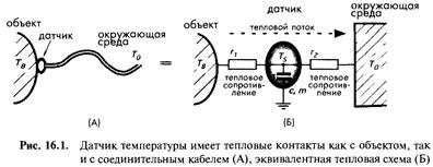 Схема на рис. 16.1Б напоминает электрическую схему, и для расчета ее параметров также применяются законы электрических цепей, такие как законы Кирхгофа и Ома (Интересно отметить, что закон Кирхгофа был первоначально выведен не для электрической цепи, а для водопровода). Теплоемкость вещества, по аналогии с электрическими цепями, отображается в виде конденсатора. Считая, что все температуры уже вышли на определенный стационарный уровень, к этой системе можно применить закон сохранения энергии, из которого следует, что тепловая энергия, переданная объектом датчику, должна быть равна энергии, отданной датчиком в окружающую среду Исходя из этого, можно записать следующее уравнение:
