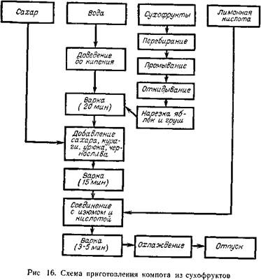Для улучшения вкуса в компот добавляют лимонную кислоту. Готовый компот охлаждают до 10 °С и выдерживают 10–12 ч для настаивания. При этом из фруктов в сироп полностью переходят вкусовые вещества, что улучшает качество компота. Сахар рекомендуют класть в начале варки, так как под действием содержащихся в сухофруктах кислот сахароза распадается на глюкозу и фруктозу (инвертный сахар), благодаря чему компот становится более сладким. Яблоки, груши, чернослив, урюк, курага, изюм и др. 125 [1]. сахар 100, кислота лимонная 1, вода 960. Компоты из консервированных яблок, груш, айвы, персиков, слив, черешни, вишни, клубники. Готовят как из одного вида фруктов, так и из нескольких. Банки с консервированным компотом промывают теплой водой и протирают полотенцем, вскрывают и сливают сироп. Затем из сахара и воды варят сироп, процеживают его, добавляют сироп от фруктов, доводят до кипения и охлаждают. Фрукты и ягоды вынимают из банок. У персиков, абрикосов удаляют косточки. Крупные фрукты разрезают на дольки или половинки. Ягоды оставляют целыми. Подготовленные фрукты и ягоды раскладывают в креманки или стаканы, чередуя по цвету, и заливают охлажденным сиропом. На порцию полагается 150 г компота. Компот из быстрозамороженных плодов и ягод. Быстрозамороженные натуральные (без сахара) фрукты вынимают из упаковки, оттаивают в течение 10– 15 мин, промывают и складывают в посуду для полного оттаивания. Крупные плоды нарезают дольками, соединяют с заранее приготовленным сиропом и доводят до кипения. Плоды или ягоды раскладывают в креманки или стаканы, заливают полученным сиропом и охлаждают перед подачей. В компот можно добавить свежие цитрусовые фрукты