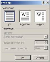 Word позволяет выполнять заглавные буквы абзацев в виде буквиц (больших заглавных букв). Эта возможность распространяется только на обычный текст. Ею нельзя пользоваться при изменении колонтитулов, таблиц и т. п. Кроме того, создание буквицы допускается только в режиме разметки страницы. При попытке создания буквицы в обычном режиме Word предлагает переключиться из него в режим разметки страницы. Для создания буквицы следует поместить курсор ввода в абзац, который будет начинаться с буквицы, а затем выбрать команду Буквица меню Формат: Окно форматирования буквицы позволяет задать ее размещение внутри текста или на поле страницы, а также отрегулировать размер.