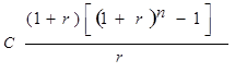 Пусть одинаковые платежи размером С (cost – стоимость) осуществляются пренумерандо в течение n периодов. На них нарастают проценты по номинальной (ежегодной) процентной ставке r. Сначала рассмотрим С по абсолютной величине. В начале первого периода осуществлен взнос С. К концу периода на него нарастут проценты, и будущая сумма составит FV1 = С·(1 + r). В начале второго периода внесена сумма С, а к концу второго периода на нее и на FV1опять нарастут проценты FV2=С·(1+r)+С·(1+r)2. К концу третьего периода FV3 = С·(1+r)+С·(1+r)2+С·(1+r)3 и т. д. К концу n-ого периода будущая сумма составит