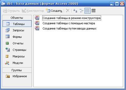 Для створення таблиці вибираємо режим Конструктора. З'являється вікно Таблица1:таблица, в якому визначається структура створюваної таблиці бази даних: вводиться ім’я поля, вибирається тип поля та задається розмір поля.