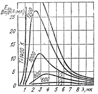 де А – поглинальна здатність тіла; R – відбивна здатність тіла; D – пропускна здатність тіла. Кожен з трьох доданків може дорівнювати одиниці: · якщо А = 1, то R = 0 і D = 0 і тіло вважають абсолютно чорним; · якщо R = 1, то A = 0 і D = 0 і тіло абсолютне біле; · якщо D = 1, то A = 0 і R = 0 і тіло є абсолютно прозорим чи діатермічним. Усі тіла в тому чи іншому ступені відбивають, поглинають чи пропускають енергію. Вони називаються сірими тілами. Закони теплового випромінювання. Закон Планка. Поверхнева густина потоку монохроматичного випромінювання для абсолютно чорного тіла залежить від довжини хвилі і температури тіла (рис.9.2):