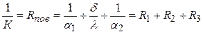 Коефіцієнт пропорційності К, Вт/м2×К, називається коефіцієнтом теплопередачі. Величина, зворотна коефіцієнту теплопередачі 1/К, називається повним термічним опором теплопередачі (Rпов).