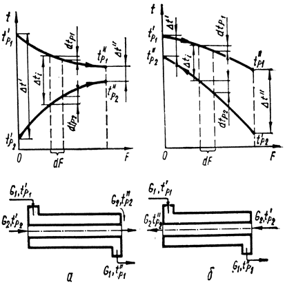Рис.9.7. Зміна температури робочих тіл при прямотоку (а) і протитоку (б).