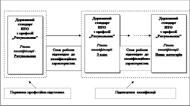 Державні стандарти з конкретних професій розробляються і затверджуються спеціально уповноваженим центральним органом виконавчої влади у сфері професійно-технічної освіти за погодженням із спеціально уповноваженим центральним органом виконавчої влади у сфері праці та соціальної політики. Так Державний стандарт з професії «Пожежний рятувальник» затверджений Наказом Міністерства освіти і науки України за погодженням Міністерства праці та соціальної політики України Структура професійної підготовки у професійно-технічному навчальному закладі першого атестаційного рівня (Навчальному пункті) в системі відомчої освіти МНС за державним стандартом має поступовий лінійний вигляд (приклад для професій - «Пожежний-рятувальник» та «Рятувальник») (рис.).