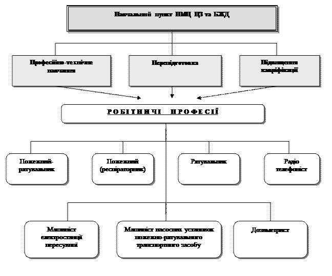 1.Підготовка фахівців сфери цивільного захисту за робітничими професіями. Загальні положення. Одним із важливих завдань щодо підтримання постійної готовності практичних підрозділів МНС до дій за призначенням є відповідний рівень забезпечення професійної майстерності особового складу у сфері цивільного захисту. Підготовка фахівців сфери цивільного захисту за робітничими професіями (рис.) для державних професійних аварійно-рятувальних (пожежно-рятувальних) служб в системі галузевої освіти проводиться на етапі первинної професійної підготовки. У відповідності до Закону України «Про професійно-технічну освіту» та Наказу МНС України від 01.07.2009 № 444 «Про затвердження Настанови з організації професійної підготовки та післядипломної освіти осіб рядового і начальницького складу органів і підрозділів цивільного захисту»: