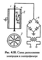 Запыленный воздух поступает через воздуховод 6 в вертикальный стояк 7. Перед поворотом на 180° воздух ударяется о поверхность воды А - А, вследствие чего сепарируются крупные частицы пыли. Далее воздух проходит через решетку 1 с отверстиями. На нее же через трубу 2 подается вода, излишки которой сливаются через трубу 8 и частично через отверстия решетки 1. Между решеткой и уровнем В - В образуется водяная пена, которая затем распространяется в объеме К, заполненном короткими фарфоровыми цилиндрами. Мелкие частицы пыли последовательно улавливаются в пене, а затем в объеме К. Электрофильтры. Их работа основана на одном из наиболее эффективных видов очистки газов от пыли – электрическом. Следует отметить, что электрофильтры также используются и для очистки тумана. Основной принцип работы - ударная ионизация газа в неоднородном электрическом поле, которое создается в зазоре между коронирующим 1 и осадительным 2 электродам