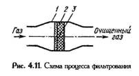 В фильтрах применяются перегородки различных типов: 1) в виде зернистых слоев, например гравия (неподвижные свободно насыпанные материалы); 2) гибкие пористые (ткани, войлоки, губчатая резина, пенополиуретан); 3) полужесткие пористые (вязаные сетки, прессованные спирали и стружка); 4) жесткие пористые (пористая керамика, пористые металлы). Фильтры 1-го типа (из гравия) используются для очистки от пылей механического происхождения (дробилок, грохота, мельниц); они дешевы, просты в эксплуатации, эффективность 0,99. Фильтры 2-го типа широко используются для тонкой очистки газов от примесей; их основные недостатки - малая термостойкость, низкая прочность.