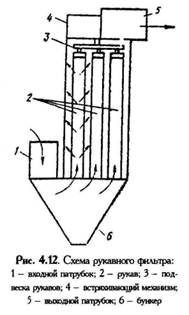 Фильтры 3-го типа, изготавливаемые из различных сталей, меди, бронзы, никеля и других металлов, могут работать в широком диапазоне частот до 1000 К, в агрессивных г.пр.пях Фильтры 4-го типа, изготавливаемые из пористой керамики и пористых металлов, обладают высокой прочностью, коррозионной стойкостью, жаростойкостью; они технологичны, находят широкое применение для очистки горючих газов и жидкостей, выбросов дыма, туманов, кислот, масел. В промышленности наиболее употребительны тканевые рукавные фильтры (рис. 4.12). В корпусе фильтра устанавливается необходимое число рукавов, на которые подается загрязненный воздух, при этом очищенный воздух выходит через патрубок. Частицы загрязнений оседают на фильтре. Насыщенные загрязненными частицами рукава продувают и встряхивают для удаления осажденных частиц пыли. Эффективность таких фильтров достигает 0,99 для частиц размером более 0,5 мкм.