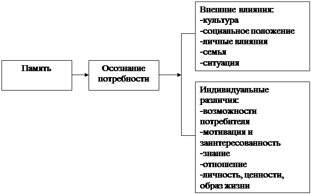 Рис. 37. Осознание потребности по степени расхождения Имея эту информацию, можно выявить наиболее сильные раздражители, которые в дальнейшем будут активно использоваться в маркетинговой деятельности. При этом следует учитывать, что предприятие может оказывать влияние лишь на маркетинговые стимулы. Воздействовать же на покупателя через побудительные факторы среды фирма может лишь опосредованно. Кроме того, колебания интенсивности потребности могут быть повышены с помощью умелой рекламы. Усилия по активизации осознания потребности различаются тем, будут ли они пытаться стимулировать основные потребности или спрос. Маркетинговая активность, концентрирующая внимание на основных потребностях, представляет собой попытку вызвать осознание основной потребности. Осознание потребности происходит тогда, когда стимулируется нужда в марке внутри товарной категории. Когда осознание потребности произошло, потребитель занимается поиском способов ее удовлетворения. Поиск можно определить как мотивированную активизацию знаний, хранящихся в памяти, или приобретение информации из внешней среды. Согласно этому определению поиск по своему характеру может быть либо внутренним, либо внешним. Внутренний поиск включает извлечение знаний из памяти, тогда как внешний поиск состоит в сборе информации на рынке. Внутренний поиск начинается сразу же после осознания потребности. Это не что иное, как поиск относящихся к решению проблемы знаний, которые хранятся в так называемой долговременной памяти (рис. 38).