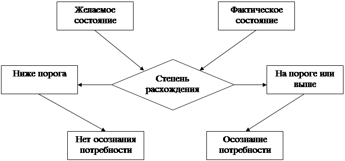 В соответствии с этим первая стадия процесса принятия решения называется осознанием потребности, которая определяется как осознание разницы между желаемым состоянием дел и фактической ситуацией, достаточной, чтобы возбудить и активизировать процесс решения. Когда нужда признана, потребитель может заняться поисками потенциальной возможности ее удовлетворения. Это вторая стадия принятия решения, которая называется поиском и определяется как мотивированная активизация в памяти знания или приобретения информации из внешней среды. Процесс осознания потребности во многом зависит от того, насколько велико расхождение между фактическим состоянием потребителя и желаемым, в котором потребителю хотелось бы оказаться. Когда это расхождение достигает определенного уровня или превышает его, потребность осознана. На рис. 36 приведен процесс осознания потребности.