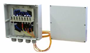 Внесені втрати на з’єднання стандартних шнурів: ОМ – 0,2...0…0,3дБ, ММ – 0,05...0…0,2дБ. З’єднувальні розетки SC можуть бути спареними. Перехідні розетки (рис. 7) використовуються для з’єднання шнурів різних стандартів, для з’єднання апаратури різних виробників. Адаптери розрізняються за призначенням. Адаптери для оголеного ОВ – це пристрої для оперативного тимчасового закінчення ОМ або ММ ОВ в буферному покритті діаметром 900 мкм. Адаптери використовуються при ремонті та оптичних вимірах. Адаптери для оголеного ОВ складаються з конектора визначеного типу (FC, ST, SC) і спеціалізованого затискного пристрою, що може утримувати волокно в буферному покритті. Типові втрати: 0,4...0,8 дБ. Адаптери типу FM використовуються у вимірювальній апаратурі. Вони підключаються до оптичного входу приладу та захищають прилади від ризику ушкодження випромінювачів і фотоприймачів при багаторазових включеннях. FM адаптери являють собою комбінацію розетки і конектора. У конекторну частину вклеєний відрізок ОВ. Типові втрати 0,4...8 дБ. Оптичні атенюатори. Їх застосовують з метою зменшення потужності оптичного сигналу. Існує кілька різновидів атенюаторів. Перемінні атенюатори-розетки (рис. 8) мають приєднувальні розміри стандартних прохідних розеток типу ST і FC і взаємозамінні з ними. Атенюатори допускають плавне регулювання величини загасання за рахунок зміни повітряного зазору. Точність установки 0,5 дБ. Діапазон плавного регулювання ST і FC: 0...15 дБ для ММ застосування, 0...20 дБ для ОМ застосування. Перемінний атенюатор FC/APC розроблений на базі стандартного атенюатора FC і відрізняється більш високою точністю установки та більшою величиною загасання (0...30 дБ). Фіксовані атенюатори-розетки (рис. 9) мають приєднувальні розміри та зовнішній вигляд стандартних прохідних розеток ST, FC. Загасання визначається каліброваним повітряним зазором. Типові значення загасань: 5, 10, 15, 20, 25, 30 дБ. Атенюатори-FM адаптери використовуються у вимірювальній та телекомунікаційній апаратурі для оперативного зниження рівня сигналу. Типові значення загасань: 5, 10, 15, 20 дБ. Перемінні атенюатори–FM адаптери мають зовнішній вигляд стандартних FM адаптерів, однак, відрізняються наявністю регулювальної гайки і стопорного кільця. Регулювання загасання здійснюється за рахунок повітряного зазору. Використовуються в якості налаштовування. Величина загасання 0…20 дБ. Точність установки 0,5 дБ. Оптичні кроси. Вони використовуються для комутації ММ ОК, з’єднувальних шнурів і електронного обладнання. Оптичні кроси розподіляються на настінні, стійкові та піддонні (рекові). Корпус кроса являє собою коробку або шафу. Настінні кроси (рис. 10) розрізняються числом розеткових портів: 8, 12, 16, 32. В них вставляються розетки FC, ST, SC або дуплексні розетки SC.