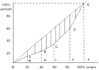 Государственная политика борьбы с безработицей. Они показывают, какая доля совокупного дохода страны сосредоточена у каждой группы населения23. Они показывают, какая доля совокупного дохода страны сосредоточена у каждой группы населения. Рассмотрим построение кривой Лоренца на примере. По оси абсцисс будем откладывать процент семей, а по оси ординат – процент получаемого суммарного дохода. Дифференциация доходов и ее измерение