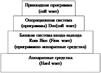 Нижний уровень компьютерной системы составляет аппаратные средства («железо»). Сюда относятся периферийные устройства. Следующий уровень образует Bios – базовая система ввода вывода – это программа данных, которая применяется для запуска компьютера, для управления ввода вывода стандартных периферийных устройств. Обычно программы Bios размещаются в микросхемах ПЗУ на материнской плате, поэтому считается, что Bios аппаратное средство. Большая часть Bios может загружаться в оперативную память из внешнего источника, как и любую программу. В этом случае Bios рассматривается как программное средство. Bios обеспечивает взаимосвязь операционной системы с периферийным устройством. Операционная система с одной стороны взаимодействует с Bios, а с другой - с прикладными программами. Поскольку операционная система это программы, то это «мягкий продукт». Прикладная программа – то для чего нужна компьютерная система того или иного уровня.