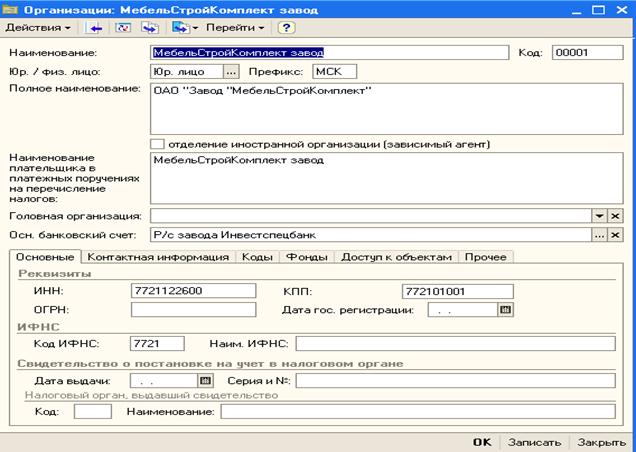 Если информационная база предусматривает создание единой базы по нескольким предприятиям, то все они регистрируются в справочнике «Организации». В качестве организации могут выступать не только юридические, но и физические лица. Каждой организации присваивается Префикс, который указывается при регистрации операции по данной организации. Экранная форма справочника выглядит следующим образом: