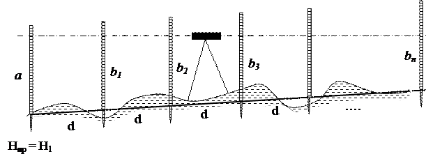 Рис. 10.3. Вынесение в натуру точек с заданной проектной отметкой 4) Построение на местности линий и плоскостей заданного уклона Построение проектной линии состоит в том, что на местности ставят ряд колышков, их верхний срез должен быть на одной прямой линии с заданным уклоном. По линии заданного уклона строят земляное полотно, кюветы, укладывают рельсы. Проектную линию можно построить несколькими способами: а) построение проектной линии горизонтальным лучом нивелира На местности разбивают n равных отрезков, длиной d. Первую точку выносят выше изложенным способом (Нпр = Н1). Нивелир устанавливают в середину участка. Рейку ставят в т. 1, берут отсчет по рейке а. Заданный уклон i. Вычисляют отсчеты b, которые должны быть по рейке, стоящей в точках 2, 3 …n. b1 = a – di, b2 = a – 2di, …………., (10.6) bn = a – ndi. Перемещают рейки в точках 2, 3 и т.д. по вертикали, пока отсчет по средней нити нивелира будет равен b1, b2 … bn. Под рейкой насыпают или убирают землю. Срезы колышков будут все на проектном уклоне.