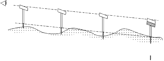 Рис. 10.5. Построение проектной линии с помощью визирок На конечных точках забивают колышки на проектные отметки. На промежуточных точках устанавливают визирки так, чтобы верхние срезы их были на одной прямой с крайними. Под основания визирок забивают колья.