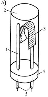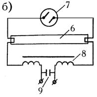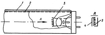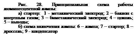 Нормальное сетевое напряжение, при котором работает лампа, недостаточно для начальной фазы возникновения разряда в лампе, если в этот момент электроды еще не раскалены. Чтобы зажечь лампу, необходимо или повысить напряжение на ее электродах или предварительно разогреть электроды, облегчив тем самым процесс возникновения потока электронов в лампе при нормальной величине напряжения. Для стандартных люминесцентных ламп низкого давления используют обычно оба этих приема. Электрический разряд в газе или парах ртути имеет по своей природе лавинный характер, и, если его не ограничивать, непрерывное увеличение электронного потока, а следовательно, и силы тока, приведет к разрушению лампы. Наоборот, даже незначительное уменьшение силы тока по каким либо причинам приводит к прекращению разряда и погасанию лампы. Поэтому для стабилизации силы тока последовательно с лампой необходимо иметь включенным балластное сопротивление, в качестве которого чаще всего применяются дроссели. Схема работы лампы представлена на рис. 28. Последовательно с лампой включен дроссель, а параллельно стартер, служащий для автоматизации прогрева электродов лампы при ее включении. Кроме того, в схему включены конденсаторы для снижения уровня радиопомех, т.к. лампа и стартер являются источниками радиоизлучений. Стартер представляет собой миниатюрную лампочку тлеющего разряда с неоновым наполнением, имеющую два электрода: никелевый и биметаллический (рис. 28 а). В нерабочем положении электроды стартера разомкнуты. При включении лампы в сеть к электродам стартера прилагается полное напряжение сети, и между ними возникает тлеющий разряд. Ток идет по цепи: сеть – дроссель – электрод лампы – стартер – второй электрод лампы – сеть (рис. 28 б). Величина тока в этот период недостаточна, чтобы разогреть электроды лампы. Под действием тлеющего разряда электроды стартера разогреваются и замыкают стартер накоротко. Величина тока резко увеличивается и быстро разогревает электроды лампы, после чего между концами спирали электрода и проволочными усами возникает начальный разряд, ионизирующий аргон вблизи электродов. За это время электроды стартера остывают и, разгибаясь при охлаждении,