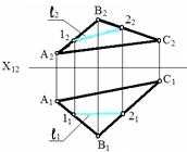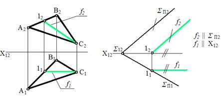 Если пл-ть задана следами, то гор-ная пр-ия фр-ли всегда || оси Х12, а фронт-ная пр-ия её - фронтальному следу пл-ти.