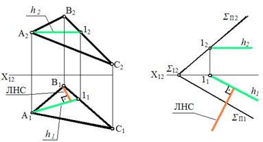 4. Линия наибольшего наклона– это линия, ^-ая к фронтали плоскости и составляющая наибольший угол с пл-тью П2.