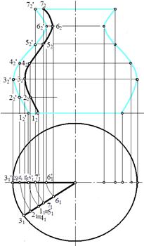 Окружность, которую т-ка описывает вокруг оси, называется параллелью. Параллель большего диаметра называется экватором, параллель меньшего диаметра – горлом. Если рассечь данную поверхность вертикальной пл-тью, проходящей через ось вращения, то эта пл-ть рассечёт поверхность по линии, называемой меридианом (образующей). Линия контура называется очерковой или главным меридианом.