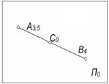 Прямая линия может быть задана пр-ми двух любых её т-ек. В пространстве расположена точка А, высота её 3 единицы. Проецируем её на пл-ть П0 Þ А3. Т.о. т-ка А расположена над пл-тью П0 на высоте 3 единицы. Т-ка В находится под пл-тью П0 Þ В-4. Соединяем данные т-ки Þ получили прямую АВ. Также появилась т-ка С – т-ка пересечения прямой АВ с пл-тью П0, её отметка = 0. Т.о. т-ка С0 –это след прямой АВ. Прямая, соединяющая пр-ии А3 и В4 т-ек А и В, является проекцией отрезка АВ - прямой линии.