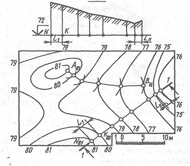 Задача Построить профиль топографической поверхности плоскостью 1 - 1. Профиль – фигура, полученная в результате сечения поверхности вертикальной плоскостью. Итак, для построения профиля рельефа местности по заданному направлению топографическую пов-ть пересекают вертикальной пл-тью и строят линию пересечения этой плоскости с топографической пов-тью. Отмечаем точки пересечения плоскости 1 – 1 и горизонталей поверхности. Þ строим эпюр линии пересечения. Для этого откладываем отметки точек на линиях проекционной связи, исходящие от каждой точки согласно масштабу, ^-но плоскости 1 – 1 Þ точки их пересечения соединяем плавной линией «от руки» - эта линия и представляет собой границу профиля.