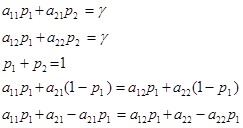 Основна теорема теорії ігор. Для матричної гри з будь-якою матрицею А величини При виборі оптимальних стратегій гравцю А завжди буде гарантований середній виграш, не менший, ніж ціна гри, за будь-якої фіксованої стратегії гравця В (а для гравця В - навпаки). Активними стратегіями гравців А і В називають стратегії, що входять до складу оптимальних змішаних стратегій відповідних гравців з ймовірностями, відмінними від нуля. Отже, до складу оптимальних змішаних стратегій можуть входити не всі апріорі задані їх стратегії. Розглянемо окремий випадок розв᾽язання задач на основі змішаних стратегій. Найпростіша гра може бути описана матрицею 2